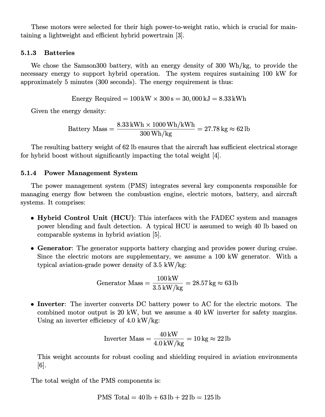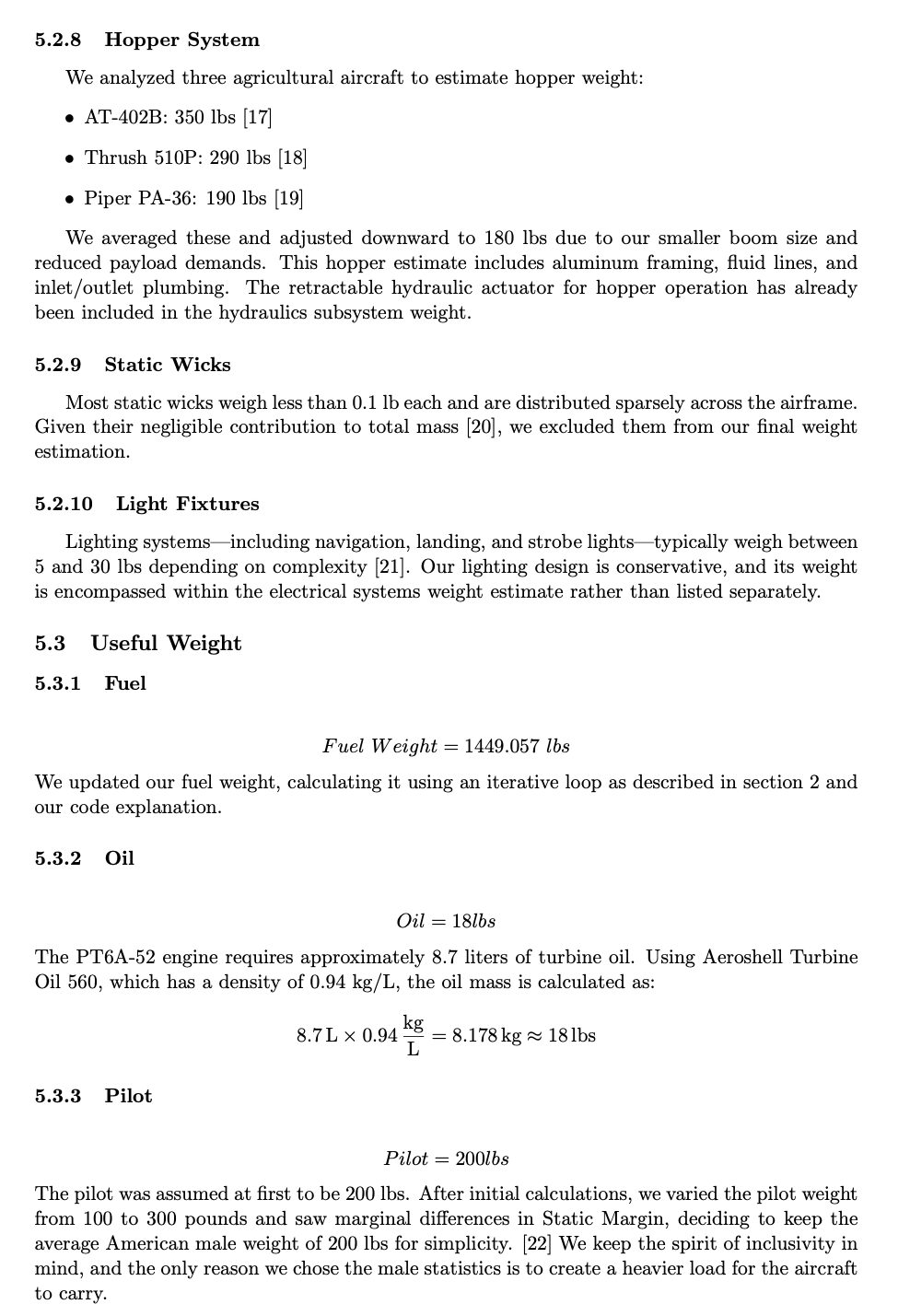 Furthermore, the weight breakdown reveals that no single subsystem dominates the air-craft’s empty weight excessively, suggesting a well-balanced design. Notably, subsystems such as the power management system, avionics, and flight control systems are slightly heavier due to the hybrid-electric propulsion configuration. However, these are justified tradeoffs given the intended hybrid operation and mission performance requirements. In summary, the updated weight and CG analysis confirms that our aircraft design is structurally viable, operationally balanced, and realistically achievable with current technology. The data reflects strong alignment with comparable aircraft while meeting the unique demands of hybrid agricultural operations. My full weight analysis is shown below.