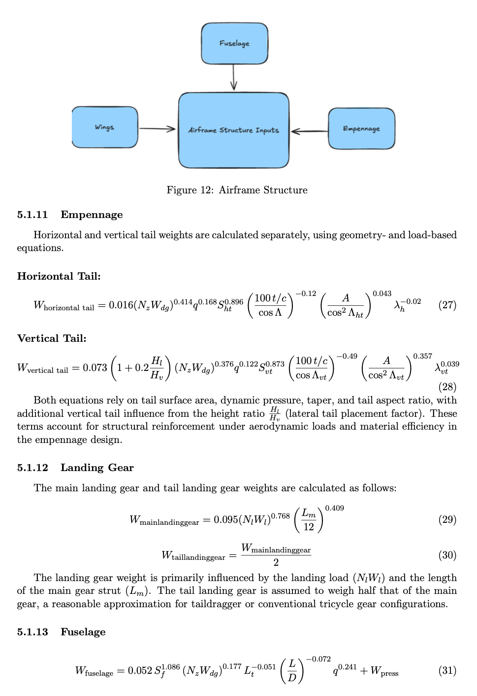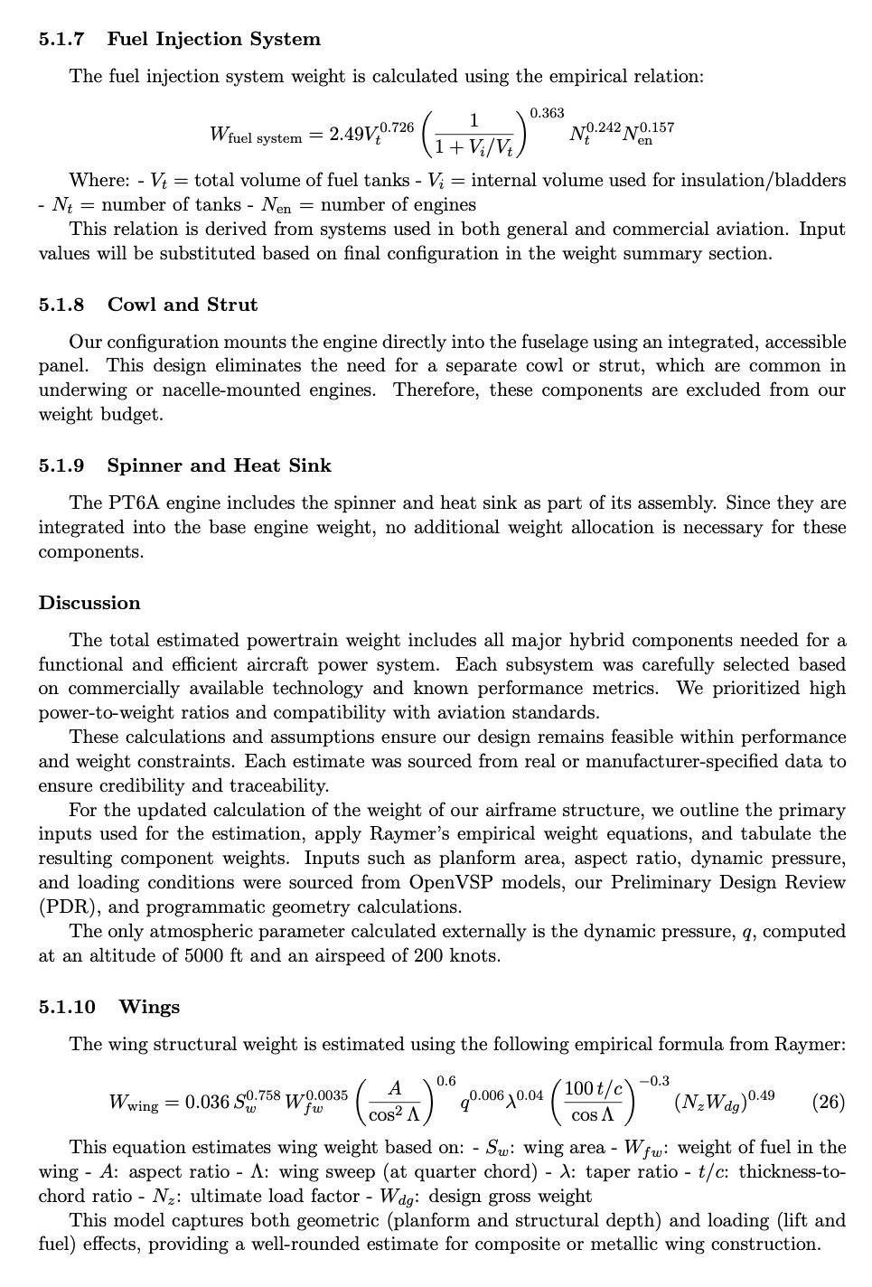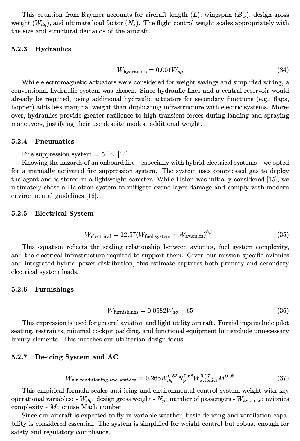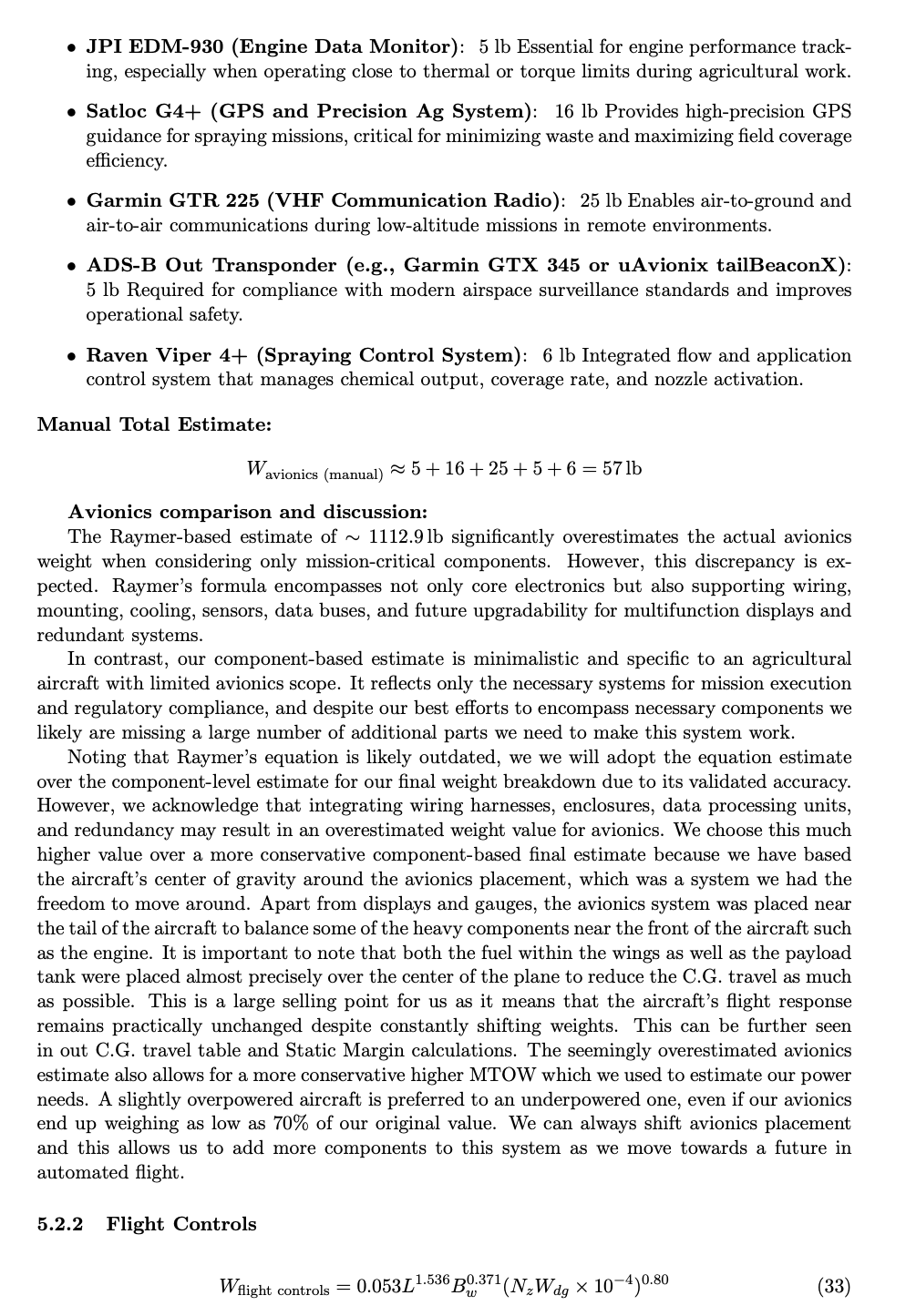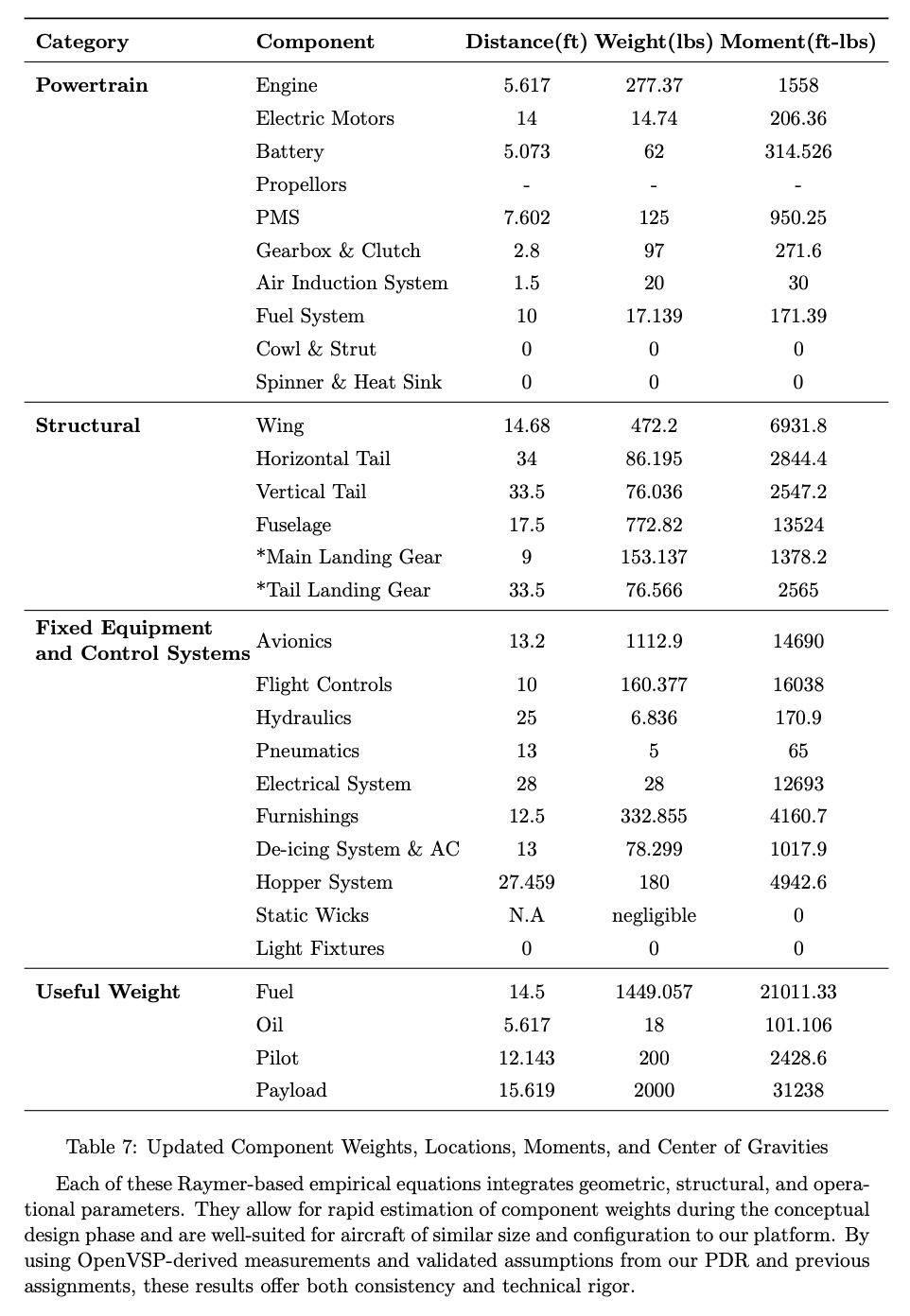 • Each subsystem weight (e.g., avionics, electrical, flight controls) was either verified with real component data or computed using conservative Raymer equations, ensuring neither underestimation nor excessive design margin.