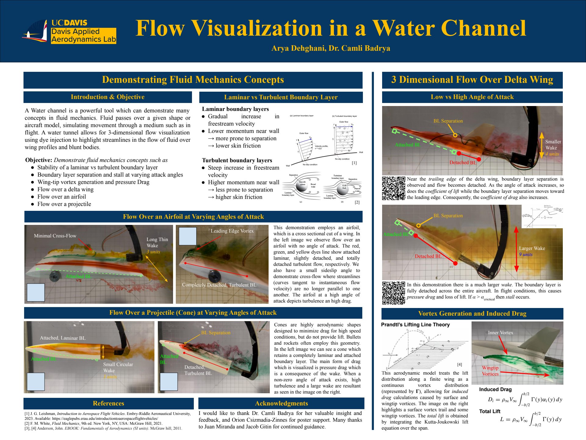 To complement my practical work, I delved into academic literature on flow visualization research using water tunnels, which provided an excellent foundation in the world of fluid mechanics beyond undergraduate classes. Along with this, I authored an abstract on blunt-body and airfoil flow visualisation using the water and smoke tunnels presenting my work at The Northern California Aerospace Symposium as well as UCDavis' annual undergraduate research competition.